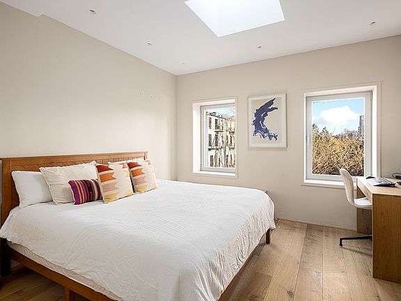 Architecturally significant center stairs lead you to the middle floor with two large bedrooms each fitted with custom floor-to-ceiling California closets. One more flight takes you to the floor-through Primary Suite, where a king-sized bedroom gives way to open eastern views over the lush backyards of Boerum Hill. The sunlit hallway has a wall full of custom closets, a walk-in closet with it's own skylight, and a beautiful primary bathroom featuring dual sinks with Kohler and Delta fixtures throughout.