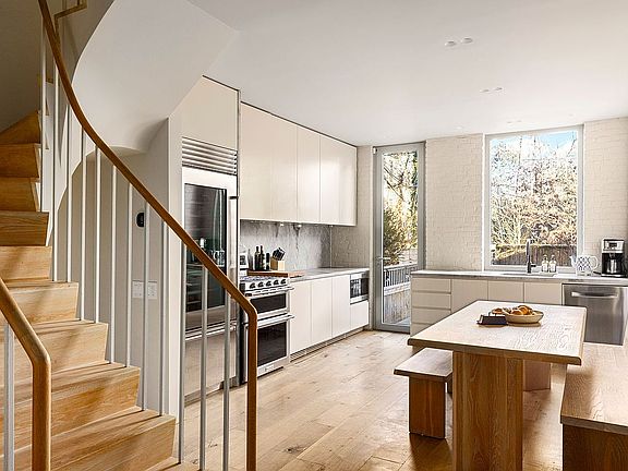 Recently gut renovated by the current owners, the resulting home incorporates both natural Scandinavian elements with urban charm and cozy vibes throughout each of the four floors. The lofty main floor allows for front to back views and is graced with wide 8" white oak flooring from Hudson Company, exposed brick and elegant Orluna lighting. The gourmet eat-in kitchen has a Subzero fridge, Bosch dishwasher and naturally beautiful Blue de Savoie Stone counters. The windowed kitchen sink looks out over your backyard and those of the townhouses lining Bergen and Wyckoff.
