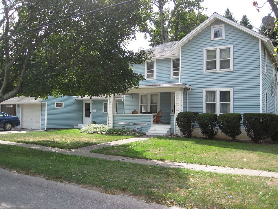 This maintenance free home is located in a great neighborhood. It is within walking distance to the center of the village. Nestled on a quiet street and on nearly four acres it is a great place to grow and raise a family. The interior includes a storage attic and basement. The first floor includes a laundry, bedroom and bath, large dining room, den, two living rooms each with outdoor access, kitchen and attached two car garage. The upstairs had four bedrooms and bath.The front porch is ideal for resting and/or reading.