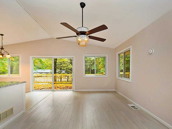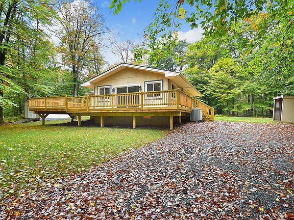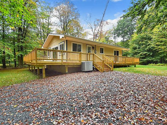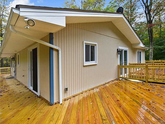 Completely remodeled contemporary home in Locust Lake Community. 3 bedrooms, 1.5 baths, an eat in kitchen with granite counter tops, backsplash, stainless steel appliances, living room w/ vaulted ceiling and chandelier, bamboo floors, and plenty of natural light in each room. Multiple sliding glass doors that lead to the wrap around deck. Brand new hot water heater, water filtration system, updated electrical work and panel, dry locked basement. 1/2 acre of land and stone circle driveway. Enjoythe lakes, beaches, tennis courts, 24/7 security that Locust Lake has to offer, while also being in close proximity to the many other amenities of the Poconos including Camelback beach and ski resort, Kalahari, Big Boulder, Pocono Raceway, Mt. Airy Casino and so much more. Book your showing today!