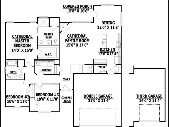 This Halifax II plan comes with a third garage, three downstairs bedrooms, plus expansive optional flex space on the second floor. The open living area, great for entertaining, encompasses a cathedral-ceiling family room, a kitchen with center island, and then spills out onto a covered back porch.