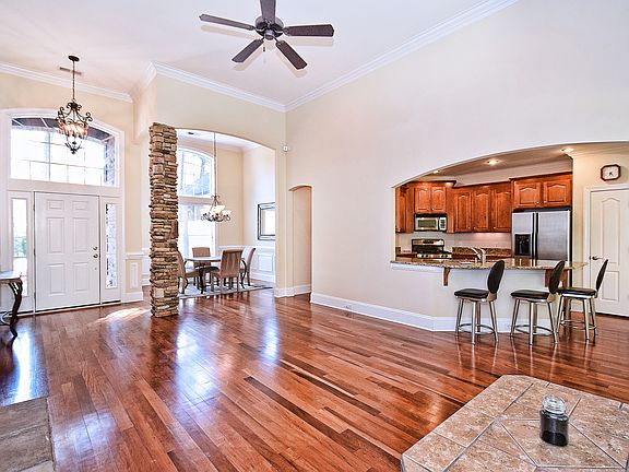 Sought After All Brick 3 BR/2 Full, 2 Half Bath Home w/2 Car Garage on 1.06 Acres. Open Floor Plan, High Ceilings, Brazilian Cherry Wood Floors, Stacked Stone Gas Fireplace. Gourmet Kitchen: Granite CT's, SS GE Appliances, Breakfast Area, Bar Seating. Master Suite w/Large Vanity, Jetted Soaker Tub, Walk-In Closet. 2 Secondary BR's w/Jack n Jill Bath. Upstairs Bonus Rm w/Wet Bar, Large Storage Area. Large Deck & Lot Backs. Upstair unheated sqft can easily be finished into another bedroom or flex space. Seller has the drywall and is willing to leave it with the house.