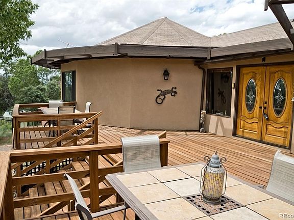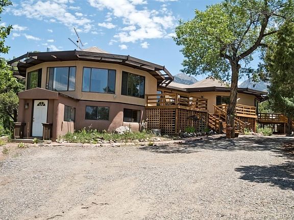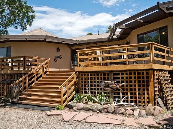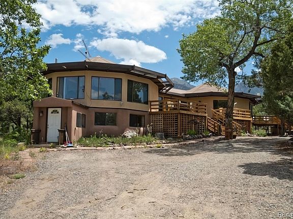 Location, Location, Location! This is a 2 lot parcel totaling 1.61 acres backing up to the desirable South Crestone Creek and Greenbelt just above the Baca Park. Set amongst mature Pine and Pinon trees, this 5 bed/3 bath home is treasure. Step onto the huge, new deck for stupendous views of Kit Carson Mountain and the San Luis Valley. Enter the double doors to the foyer. The great room offers tons of space, large windows for viewing the serene back yard and greenbelt, sliding patio doors off the dining area to an additional deck perfect for morning coffee or grilling dinner, and a local rock/stone fireplace as the center piece. The kitchen offers a passthrough to the dinning area, granite counters, and a creative pantry. On the west octogonal wing there is a long hall to 3 bedrooms and 2 baths. Each bedroom has spacious closets and large windows. The primary bedroom also offers a woodstove for cozy winter evenings and a window air conditioner for those warm summer evenings. Each full bath has a jetted tub, plenty of storage, and charming tile sinks and countertops(see photos!) Under the west wing there is a private entrance to a cozy strawbale 2 bedroom apartment. Perfect for a rental or mother-in-law suite with its own 3/4 bath and kitchen. Only minutes to town on a paved road the location couldn't be better. The Baca offers amenities such as fire hydrants, a staffed firehouse & EMTs, parks, a golf course, tennis courts & greenbelt trails to 100,000's acres of public lands. The Baca park is just steps out your back door and connects to many of these trails. With the beauty of the natural landscape surrounding you yet minutes to the charming town of Crestone offering amenities such as gas, natural/organic meats & produce, groceries, USPS, cafe, restaurant, brew pub, gallery, gifts, hardware, and liquor stores. With its serene, wooded location, abundant natural light, views and more, this home is a true sanctuary. Call today to schedule your showing!