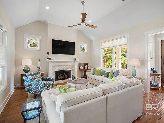 Welcome to 159 Mulberry Lane in Fairhope, Alabama—an elegant 2-bedroom, 2-bath home with 1,822 sq ft of open living space, nestled in the exclusive Original Phase 1 of Battles Trace at the Colony at the Grand. This beautifully designed residence features vaulted ceilings, a gas fireplace, and an abundance of natural light enhanced by custom Hunter Douglas white linen shades. The gourmet kitchen boasts white quartz counters, a center island, and stainless steel appliances, while the spacious master suite includes a luxurious bath and walk-in closet. A split floor plan offers privacy with a second bedroom and a flexible office that could serve as a third bedroom. Situated on a 0.20-acre lot with a 2-car garage, this home provides access to resort-style amenities including walking trails, lakes, pickleball and tennis courts, multiple pools, a clubhouse with restaurant, two 18-hole golf courses, a state-of-the-art fitness center, and a laser-leveled croquet lawn—all just minutes from downtown Fairhope.