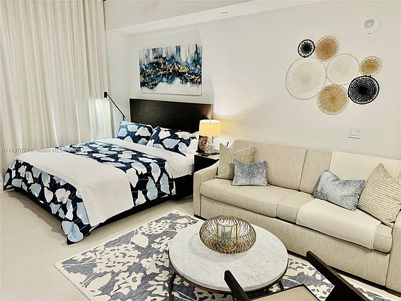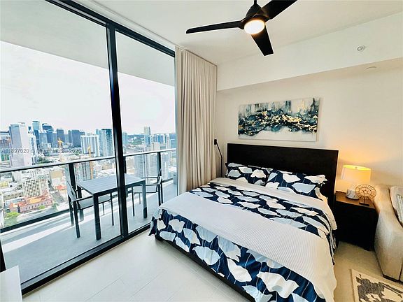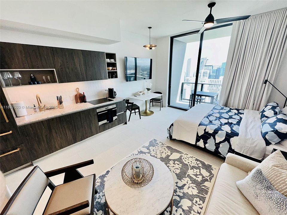 Live sky-high in this furnished studio perched on the 49th floor with sweeping city and bay views from every angle. Unit 4906 offers an airy open layout with floor-to-ceiling glass, modern European-style kitchen, quartz counters, and designer finishes delivering the perfect mix. Enjoy a private balcony overlooking Downtown Miami and Biscayne Bay, ideal for morning coffee or sunset. Fully equipped and move-in ready, this residence suits professionals, digital nomads, or investors seeking a high-return rental property. Residents enjoy access to resort-style amenities: an infinity pool, spa, fitness center, coworking spaces, rooftop deck, and 24-hour security and valet. All this just steps from Miami Worldcenter, Brightline Station, Kaseya Center, and Brickell's dining scene.