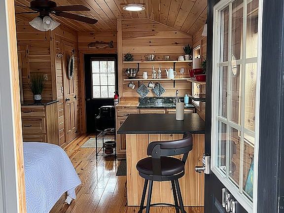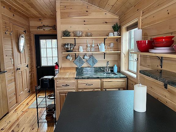 Selling dwelling only. Amish built tiny house log sided cabin. Excellent history of short term rental income. Would make a great ADU (Accessory Dwelling Unit), or guest quarters. Utility building includes washer/dryer hook up, Rinnai tankless hot water heater, expansion water tank, water filter, separate electric panel in utility building. Cabin has low maintenance knotty pine, tongue and groove ceilings and walls, electric baseboard, ceiling fan, appliances and furniture convey, mini kitchen, granite counter tops/island. Built on skids for easy removal and relocation to your land. Cabin does not include lot. Granite blocks are available to set cabin on as shown if desired. Custom stairs attached with hinges on front stairs, back stairs off back door. Cabin was built in 2016. Dimensions for the cabin is 13' x 26'. Detached utility room is 5' x 7'. Contact Ashlee at 207-266-9994 for more information.