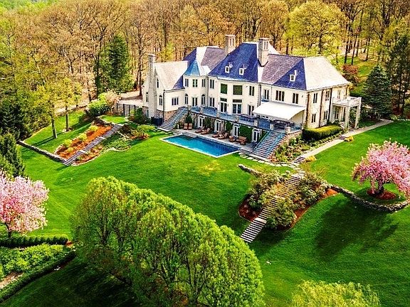 Panoramic views extending nearly 50 miles characterize the 10+ acre hillside setting of a gracious French country manor in Far Hills. Custom-built in 1987, an elegant interior reveals 18 rooms within approximately 15,000 +/- square feet of majestic living space on three levels. A façade of stone and stucco is capped by grand manor rooflines clad in slate, while an entrance courtyard edged by stone walls recalls classic French architecture. Privately situated on open and wooded acreage, gently sloping grounds at the rear of the home offer dramatic vistas of the valley below and distant hillsides miles away. An elevated promontory provides a verdant backdrop for a classic pool, illuminated tennis court and a charming lily pond. The four-stall horse barn with paddock is perfect for equestrian activities. Approached by a long, winding private drive marked by stone columns, this stately home is arranged on three finished levels with five bedrooms, eight full baths and a powder room plus a lower level au pair suite with bedroom and another full bath. Interior highlights are numerous and include custom-milled woodwork, mahogany doors, flooring of Italian marble, Mexican quarry tile, oak and mahogany, soaring ceiling heights, six elegantly mantled wood-burning fireplaces and an abundance of recessed lighting. Introducing this impressive manor is a foyer featuring a sweeping staircase edged by custom brass railings, a 21-foot ceiling and Italian marble flooring. Nearby, a formal powder room has a marble sink and floors. Beyond this dramatic entry, a great room presents a marble fireplace, oak floors with mahogany inlays, a 21-foot rotunda-style ceiling illuminated by a chandelier and a 12-foot wet bar topped in marble. Three sets of French doors open to a flagstone terrace overlooking the swimming pool, tennis court and panoramic views. Special occasions take on extra significance informal living and dining rooms, both appointed with oak floors bordered in mahogany. Relaxation is assured in the sun-filled garden room featuring floors of Mexican quarry tile and French doors to the gardens. The open, flowing floor plan continues in a butler's pantry which leads to the spacious eat-in kitchen with stone fireplace. Every imaginable amenity graces the chef's kitchen, with its 14-foot center island and extensive array of upscale stainless steel appliances. Custom cabinetry, granite countertops, hexagonal Mexican quarry tile floors, a pantry, fitted closet and rear staircase are notable amenities. Echoing the shape of the Mexican tile floors, the focal point is a hexagonal breakfast room. This room opens to the terrace through French doors. Just off the kitchen area is a multi-purpose room and full bath. Handsomely appointed, the family room has random-width oak-pegged floors, painted barn siding, a stone and stucco fireplace, built-in bookcases and a beamed ceiling. A rear gallery hallway with marble flooring leads to the peaceful solitude of a walnut-paneled library anchored by a marble fireplace. Built-in cabinetry, bookcases and two sets of French doors to the terrace enhance this space filled with warm wood tones. A handsome home theater completes this level. A lavish master retreat upstairs situated in a private wing of the home encompasses a series of stylish rooms for the owners. Two individual master baths brimming with spa-like details, two room-sized closet rooms fitted with organizers, French doors to a private balcony, and a bedchamber with marble fireplace each contain scores of thoughtful design elements. Another highlight is the fully mirrored octagonal dressing room with marble floors. The opposite wing of the second story contains four bedroom suites, each with its own full tile bath, and one featuring a fireplace. Matching the same design caliber as the main and second floors, the finished lower level presents an au pair suite, an octagonal-shaped wine room, exercise room, sauna, a full bath, laundry room, three large, unfinished storage rooms, and a slate-floored gallery offering multiple sets of French doors to the terrace, rear grounds, pool and tennis court. Extensively landscaped, the scenic property includes a pond with waterfall surrounded by glorious perennial gardens and a rose garden. Spanning the rear of the home, a slate terrace has stairways to the extensive grounds including an illuminated tennis court, four-stall barn and paddock. The resort-style classic pool edged by a terrace adjoins a lanai. Expansive storage areas, numerous closets and an attached and heated oversized four-car garage provide ample storage options. Courtyard parking is framed by stacked stone walls. Additional exterior features are copper soffit gutters and leaders, grounded lightning rods, double Thermopane high efficiency Pella windows and a generator. Mechanical workings include a central security system, central vacuum, forced hot air heat with humidifiers, multiple zones of central air conditioning, private septic, well water, copper plumbing, a 100-gallon commercial hot water heater, 600-amp electric service, and separate electric service to the tennis court and pool. An extensive irrigation system maintains the grounds. Incorporating an Old World sensibility with a host of modern updates throughout, this one-of-a-kind French country home is a rare offering in a coveted location. Far Hills in Somerset County is about 45 miles west of New York City and close to a network of highways and Midtown Direct train service for commuters. Rural in nature, Far Hills is a five square-mile borough with a small shopping district and train station. Centrally located near public and private schools, world-class golf courses, a wide range of upscale shopping venues, equestrian pursuits, recreational and cultural events, this captivating locale is also about a 30-minute drive from Newark Liberty International Airport.