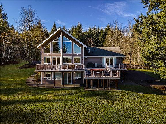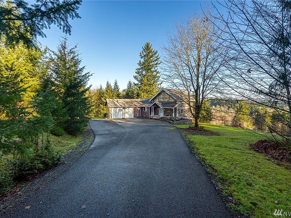 Private Estate Setting for a Stunning View Home. Open concept living, dramatic 2-story wall of windows, allowing you to greet Mt. Rainier. Beautiful kitchen w/granite counters & upscale appliances. The master suite features newly updated bathroom. Great loft office area or just to get away. Lower floor features a huge family room area w/fireplace & built ins, great extended living space with a 2nd kitchen area. Large storage room plus workshop or 2nd garage for your projects. Take in the views as you sit on your expansive deck w/hot tub. Orchard area & an amazing tree house with wide screen TV, not something you see every day! Nestled on 15-acres which have been divided into 3 parcels (addt'l building sites) off long private drive.