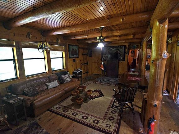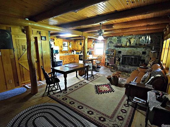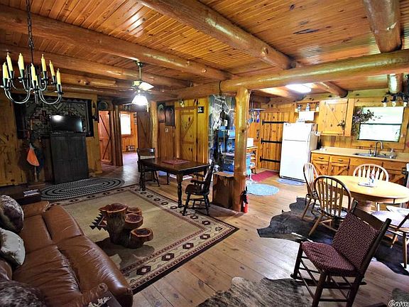 Amazing! One of a kind! Rustic home on 4+ acres with 400 square foot quest cabin. Log beams, log walls, rock fireplace, updated baths in main cabin. Gorgeous, fenced pasture, log barn, storage shed and pole shed. Garden spot. Kohler, propane powered generator which runs both cabins. Many attractive little and big touches everywhere. Front and back porches on main home, the back overlooking Mill Creek which is on property. Peaceful, country setting awaiting you.