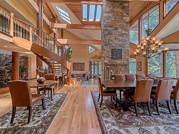 Nestled on a private 12.98-acre gentle lot in the coveted Upper Bear Creek Ranch gated community, this gorgeous property is the quintessential Colorado Estate. The setting offers breathtaking mountain surroundings that enjoy unparalleled serenity. As you enter the property, you are greeted by a jaw-dropping great room featuring cathedral ceilings, a gorgeous structural beam design, and an incredible south-facing wall of custom windows that floods the space with natural light. Multiple skylights further enhance the bright and airy atmosphere of this mountain retreat. The high-end professional series kitchen appliances create a gourmet kitchen assisted by the butler's pantry and walk-in pantry. The open-concept floor plan is ideal for entertaining, and the private primary suite wing with an office is the ultimate space for work or relaxation. Outside, you will find extensive gardens and landscaping that complement the natural beauty of the area. The 1 bedroom, 1 bath, 851-square-foot guest house is lovely and comfortably accommodates friends and family. A concrete tile roof gives peace of mind and adds to the durability and longevity of this stunning home. With a 6+ car attached garage, you'll have plenty of room for all your toys and vehicles. The combination of privacy, tranquility, and luxury offered by this mountain retreat is truly unparalleled. Come and experience the best that mountain living has to offer in this extraordinary home.