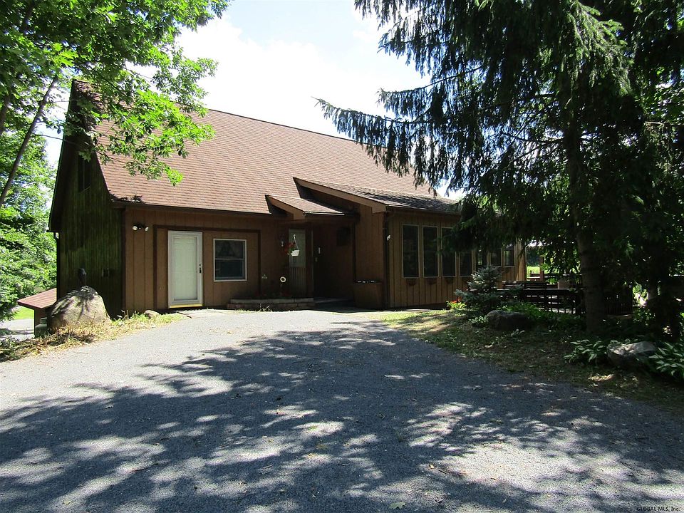 Take a look at this one of a kind contemporary style home on 1.9 acres. Quiet, private peaceful setting with lovely gardens, large pond w/dock and outside entertainment area. 3 BR 2.5 Baths. Large great room style home with exposed beams and wood floors. Living room has a gas stove for warm cozy winter nights. This home is great for entertaining and hosting family gatherings. The cook inthe family will love the upgraded kitchen with radiant heat in the floor. BONUS; Seller will be giving a $5000 flooring allowance at time of closing to purchase new flooring of buyers choice. Additional bonus is the 3 car garage for the man in the family. This unique property is a must see. Easy to work at home from this property with an office area on one floor. MOTIVATED SELLER--RELOCATED OWNER.