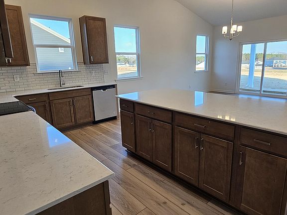 Our most popular 3-bedroom ranch home includes 2 full bathrooms and a versatile office/flex room, perfect for a home office or playroom. The main living area features an open floor plan with LVP flooring and nearly 11-foot volume ceilings in the living room, nook, and kitchen and 9-foot ceiling in the remainder of the home offering a spacious and airy feel. The kitchen is equipped with a large island, 42'' Quill cabinets with upgraded hardware, Lagoon white Silestone quartz countertops, and a white subway tile backsplash. The primary suite offers a spacious retreat with a tiled shower in the bathroom. Enjoy the stunning views from the 10x10 covered back porch overlooking a wooded community from the high point of the community, along with a level ½ acre backyard ideal for outdoor living. The front yard is fully landscaped, and the home has a rocking chair front porch.