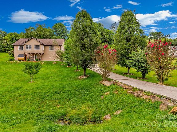 Beautiful 4-bedroom, 3-bath home on 1.43 acres just 10 minutes from downtown Asheville. The main level offers 3 bedrooms, a bright living room, a spacious kitchen, and the convenience of laundry in the primary suite. Enjoy the sunroom overlooking the front yard. Downstairs, the basement/garage level features an additional bedroom, bonus family room, and another living room—perfect for guests or multi-generational living. Hardwood floors run throughout the home, adding warmth and charm. Outdoors, unwind in your private sauna or hot tub, tend to the large garden, or relax by the fire pit. Stroll among fruit trees—pear, apple, cherry, and peach—planted across the property. Solar panels on the roof help with energy efficiency. This home blends comfort, functionality, and natural beauty, offering peaceful living with quick access to Asheville’s vibrant downtown and just down the road from grocery stores and restaurant.