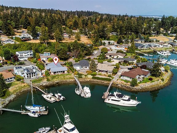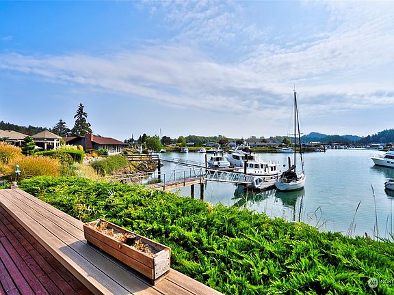 After an exhilarating day of cruising the SJ Islands, you return home with friends and secure the boat to your private 43' dock. Enjoy the waning rays of sunlight from the expansive deck peering upon the quiet bay surrounded by boats and neighboring homes. Enjoy a pleasant dinner in the open concept living area where everyone has gathered for the festivities. The warmth of the fireplace in the living room will soothe the soul. Comfortably sized home of 2179 Square Feet with 3.0 baths, a large primary suite with fireplace. The second suite features private bath. Office with wet bar for those busy workdays. There is a 3 car garage with abundant storage and plentiful parking. Leased Land.