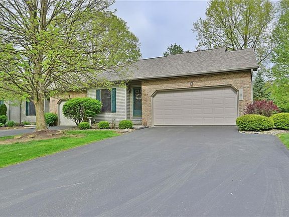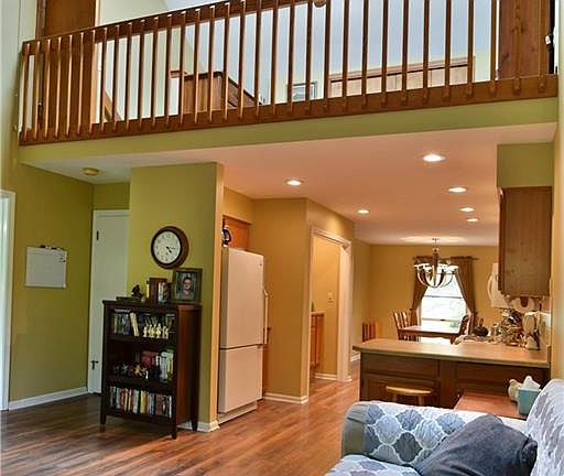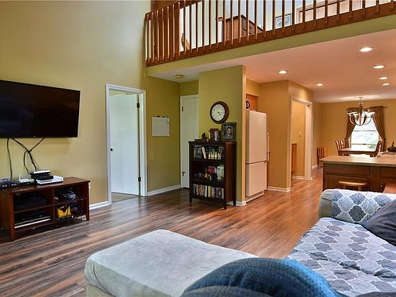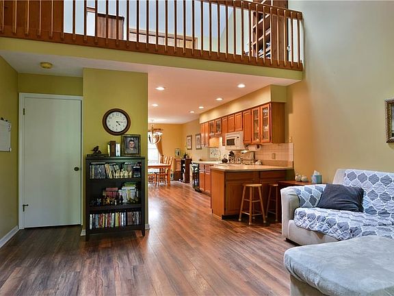 Find home with this beautifully kept and appointed Cortland condo! Nestled in a lush, tree lined setting this relaxing estate offers scenic views mixed with tastefully updated living space. The first floor welcomes you in with an open layout that begins with a delightful dining area sat beneath bespoke lighting. Hardwood style flooring runs beneath and continues out through the oversized galley kitchen and into the robust living room. The kitchen itself is marked with recessed lighting and long countertops that include inset cabinetry opposite the main surface area. A tiled backsplash joins bar style seating at the far end. Meanwhile, overhead skylights fill the living room with natural light as the second story loft space looks down past the gated banister. A charming, finished sunroom makes for a great place to take in the views, while the master bedroom suite is found around the corner. Inside, a walk-in closet and a full bath with unique glass block shower reside. Upstairs, an additional full bath can be found at the landing. Laundry and additional storage are located at the basement level.Brand new furnace in 2020.