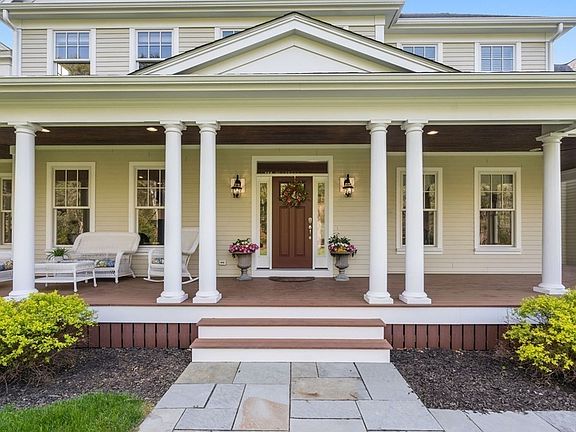 5/14 OH CANCELLED! Spectacular young farmhouse colonial nestled in a picturesque setting on 2.4 professionally landscaped acres set back from the road. The heart of this pristine home is the stunning open eat-in kitchen/living area. The chef’s kitchen offers Viking appliances, oversized island, custom tile and butler’s pantry. Coffered ceiling family room features fieldstone fireplace and slider to large deck w/ amazing sunset views. Formal living room with dual-sided gas fireplace (other side warms cozy corner office) and tray-ceilinged dining room. Large mudroom with built-in cubbies, 2nd pantry and access to 3-car garage. Upstairs features a spacious primary suite with travertine marble bathroom and his and her walk-in closets, two additional en suite bedrooms and two more bedrooms sharing Jack and Jill bath. Lower level offers high level of finish including wet bar and flexible space for recreation, fitness and media and opens to bluestone patio and private backyard.