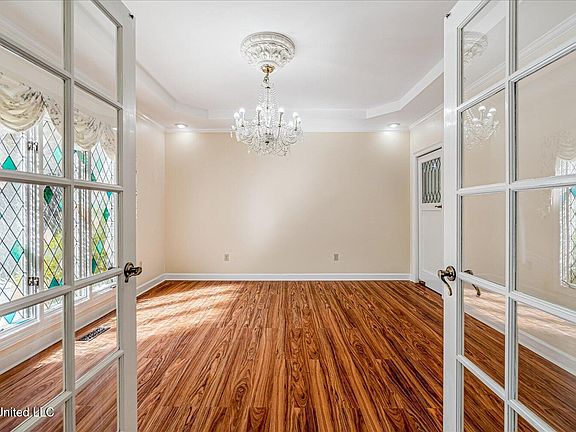 Formal Dining Room: Elegant touches include a butler's pantry, French doors, custom chandelier base, and stained-glass accents.