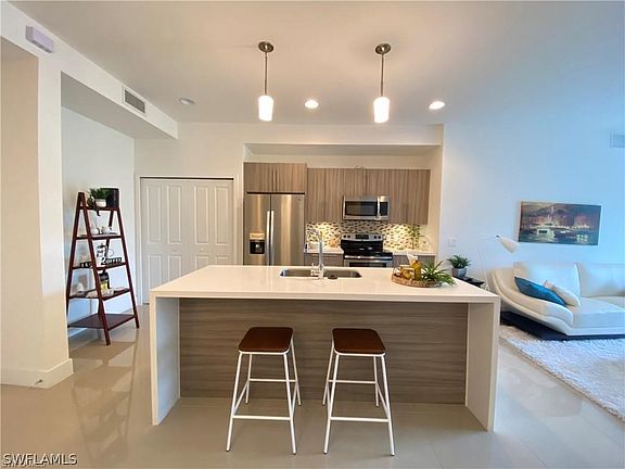 UNDER CONSTRUCTION - est. completion summer 2023! ONLY 2 of these floor-plans available: Spacious 1 BR + DEN/Office with 2 Bathrooms and pool views! Luxurious Condo with 10 ft high ceilings, 8ft high door ways, European-style kitchen with quartz countertops, tile throughout & luxury vinyl plank flooring in the bedroom (all included, no upgrades). All appliances included (stainless steel - GE). PRIME location just minutes to Bunchee-, Fort Myers- or Sanibel Beach & walkable to shops & restaurants. Gated entrance, hurricane impact windows & street lights over your covered parking affords you all the privacy & security you need (built to the newest codes + 1 year wall to wall warranty). Enjoy Florida’s Lifestyle on the spacious sun deck with a geometric swimming pool & heated spa or maybe dinner by the outdoor BBQ area? Private exercise room and sundeck facing the pond, in building#5 only. Short 4 mile drive/bike ride to the beach is making this Condo the perfect seasonal rental or a 2nd home to escape the cold winters! Pictures from a different model