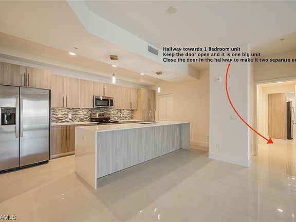 PRICE REDUCTION! Two Condos, one unit! Check out this unique opportunity to own a Duplex Condo/ Condo with an in-law suit! This floor-plan offers a 2 Bedrooms/2 Bathrooms & 1 Bedroom/2 Bathrooms unit which is connected through a hall way. Each unit has its own separate entrance door and and covered parking assigned. Luxurious new construction condo with ~10 ft high ceilings, 8ft high door ways, European-style kitchen with quartz countertops, tile throughout & luxury vinyl plank flooring in the bedrooms. This unit includes a total of 2 washer & dryers, 2 refrigerators, 2 dishwashers, and 2 microwaves. The two bedroom unit comes with a spacious screened-in lanai and is overlooking the pool area. The hallway connects both units so you can use it as one big condo with a guest suite, live on one side and rent out the other or rent out both sides but only pay one maintenance fee! PRIME location just minutes to Bunchee-, Fort Myers- or Sanibel Beach and walkable to shops & restaurants. Gated entrance, hurricane impact windows & street lights over your covered parking affords you all the privacy & security you need. Amenities include a sun deck with a swimming pool, outdoor BBQ area, a private exercise room and a sundeck facing the pond. One year builder warranty included. Pictures are virtually staged.