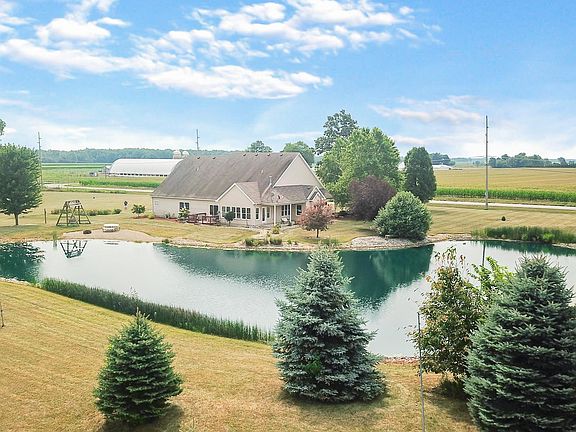 Spacious custom built home on just under 4 acres w/ ½ acre stocked private pond. Beautiful countryside w/ convenient access to 469 & Chapel Ridge shopping center only 5 min away. Professional landscaping, privacy trees & deep covered front porch. Welcoming front door w/ stained glass sidelights. Vaulted tile entryway & front office behind french doors w/ large windows & bright airy ambiance. Stylish wainscoting in hall leads to open plan dining/kitchen/living area. Breakfast bar, stainless steel appliances & plenty of counter space in kitchen w/ 2 sinks. Recessed ceiling in living room w/ brick fireplace; multiple ceiling fans along w/ double pane storm windows & geothermal heating/cooling makes for optimized temperature control. Master en suite features luxurious jetted tub behind twin columns, frosted windows. Plenty of storage throughout with ample closet space & double walk-out attics. Enjoy backyard pond views from the comfort of 4-season room, back porch, or beach area. Perfect escape from hectic city life--come experience the peace!