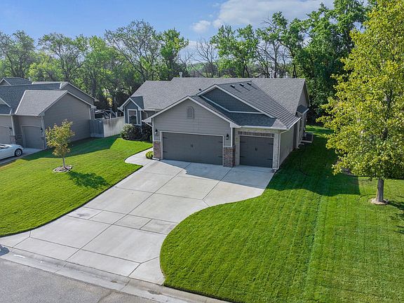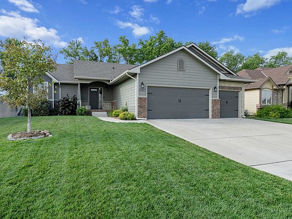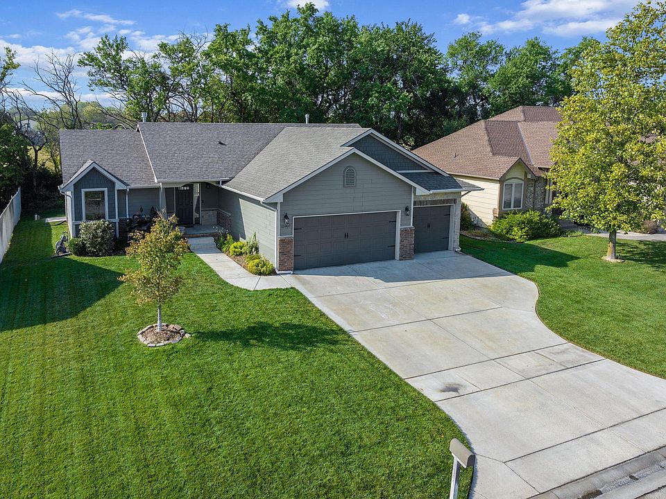 GIVE YOURSELF THE GIFT OF HOME THIS HOLIDAY SEASON! This Whispering Lakes ranch home features a split bedroom floor plan, finished basement, is situated on a tree-lined lot and is ready for YOU! Arrive and you are greeted with lush lawn and landscaping, covered porch, brick and stone accents and fantastic curb appeal. Walk through the front door and you will appreciate the wood floors, charming gas fireplace, show-stopping windows, built-in cabinets and shelving, vaulted ceiling and open-concept living, kitchen and dining. The kitchen features stainless steel appliances, tile floors, walk-in pantry for maximum storage space, granite countertops and eating bar. A favorite feature in this home is the separate laundry room situated just off of the kitchen and garage entry. The primary bedroom suite is the perfect escape after a long day and checks all the boxes including a tray ceiling, bay window, walk-in closet, two sinks, granite countertops, large soaker tub and beautiful tile shower. There are two additional bedrooms, storage closets and a full bathroom also located on the main level. Enjoy backyard access just off the dining area or at the mid-level walk-out. The basement family room and recreation area is the perfect space to enjoy a family movie night or host your family and friends for the big game. Gather around the large bar with sink, kegerator featuring your favorite beverage, granite eating bar, floating shelves, tiled floors and feature wall. The fourth bedroom, third full bathroom and additional storage space is also located in the basement. We saved the best for last! This is the dreamy backyard sanctuary you've been waiting for. Sip coffee on the covered deck, enjoy yard games on the green lawn and all while tucked amongst the beautiful tree-line for the utmost privacy. Upgrades also include the sprinkler system and irrigation well. Both adjoining neighbors have fenced yards, so if a fence is important to you it will be an easy addition! Recent improvements throughout include: MAY 2022 ROOF, fresh paint in living, kitchen, dining, upstairs bedrooms and primary bathroom. DON'T FORGET: SPECIAL TAXES HAVE BEEN PAID OFF! Neighborhood amenities include swimming pool, walking paths and pond. If you're seeking Andover Schools, consider the upcoming open enrollment opportunities! Your new address awaits - let's get you situated just in time for the upcoming holidays on Rosewood Street!