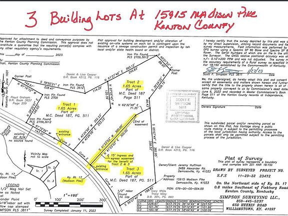 this sale included tract 1 & 2 for a total of 3.3 acres.3 Beautiful Building Lots to Choose From!- Each is Approximately 1.65 Acres with a combination of Cleared Land & Woods! City Water/Owen Electric/Alta Fioptics*Wonderful Place for Your New Home with Room for Gardening/Pets/Outdoor Fun and Maybe that Detached Garage! Kenton County Schools * Just a Few Minutes South of Piner Intersection! Perfect for Your New Home Site!