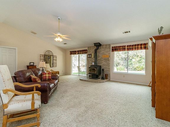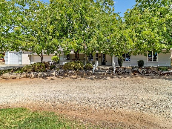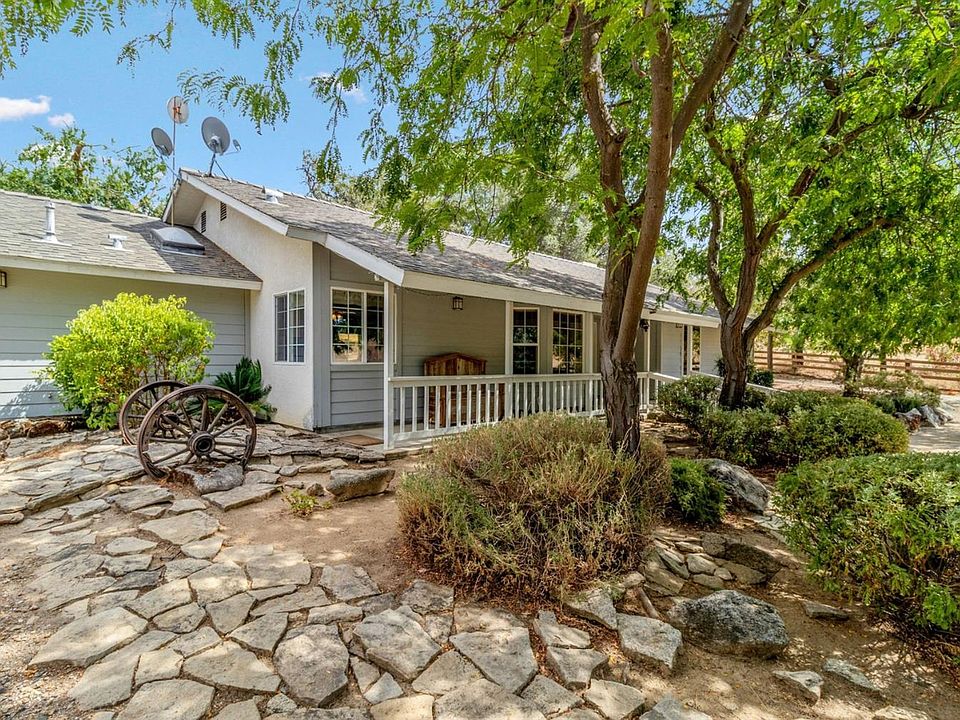 Ranch or retire! Almost 20 acres fenced and cross-fenced to make 3 pastures. Largest pasture has automatic water tank and catch pen, perfect for raising cattle. Pole barn w/water, 4 inside stalls (2 in & outs''), storage area, hay area and room for horse trailer/RV. Three outside stalls with automatic watering system. Tack room, large arena with water, pond and seasonal creeks. Garden area, tool shed, and chicken coop with 7 laying hens. Home is 3 bedroom, 3 bath, with a large, open floor plan. Tons of storage, large patio and landscaping with automatic watering system. Master suite with his and her walk-in closets. RV garage/shop with electric, water, and its own evaporative cooler. Seller states well is 25 gpm. Whole-house water filtration system. Backyard has amazing rock outcroppings. Fruit trees and grapevines. Lightning fast, fiber optic internet with buried cable. Sellers to provide one year home warranty.