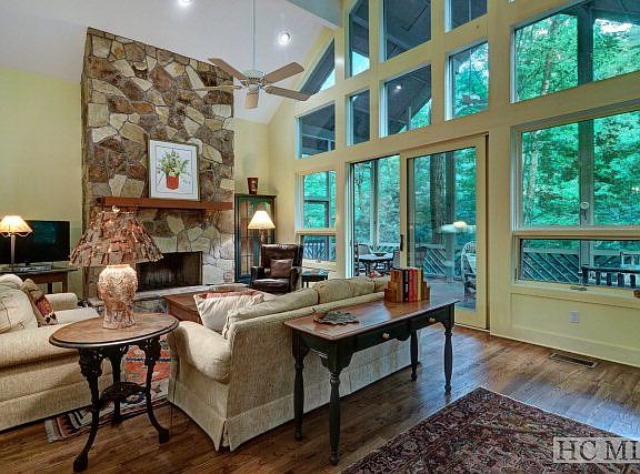 Bright, light, open floorplan makes this home live large. The greatroom has soaring ceilings with a floor to ceiling stone fireplace as the focal point for the room. The kitchen is open and has a long serving bar perfect for family and guest to congregate. The greatroom opens to a large screened in porch which not only provides seating for 8-10 but also accommodates a dining area. The master has a wonderful bath with separate shower and garden tub plus dual vanities and a large walk-in closet. In addition there are two guest suites. All this on one level with no maintenance landscaping. Falcon Ridge is great location in the club to walk your dog, jog, stroll or bike. Social or Golf Membership in Highlands Falls is available with approval but not required.