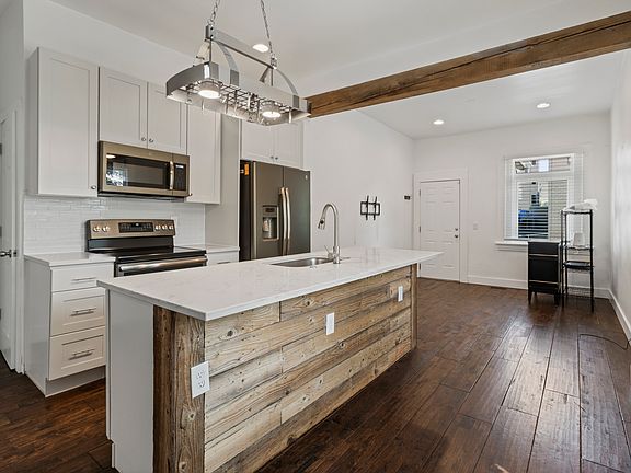 - Update kitchen with stainless steel appliances including glass top stove, oven, dishwasher, microwave, and refrigerator