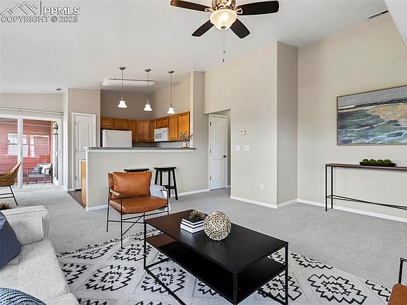 Conveniently located in southeast Colorado Springs, this top floor, corner condo has a mountain view and offers easy access to get around town or hop on the highway. Access the home through the private entrance or through the 1 car garage and up a flight of stairs to the open and bright living space all on one level. This home features vaulted ceilings, an open floor plan and covered deck. Get comfortable here with brand new carpet throughout, fresh interior paint, a well appointed kitchen, dining area and living room. The primary suite has a spacious walk-in closet & fully outfitted bath with a walk in shower and private walk out deck. An additional bedroom and full bath make this a versatile condo. Community offers clubhouse space for gatherings, parks, playgrounds and greenways. This condo is ready to move in and make it your own.