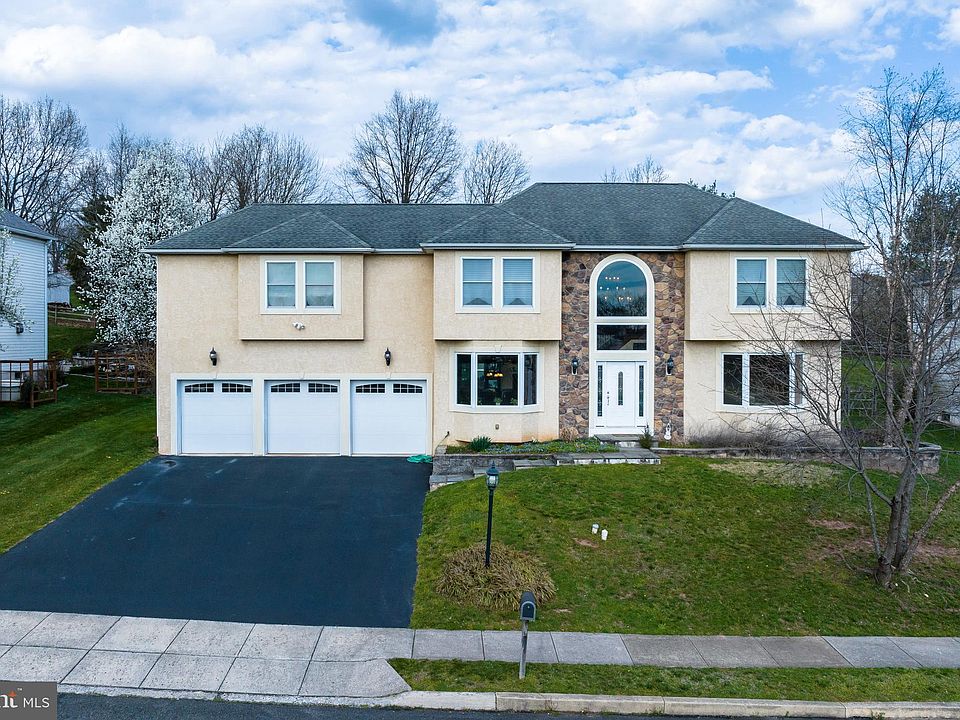 5 bedroom “beauty” in the ever-popular Brookside Farms in Lower Pottsgrove! This home boasts over 3000 square feet of living space. Upon entering the home there is a 2-story open foyer with hardwood flooring, coat closet, and a dramatic light fixture. The living room/office is to the right of the foyer. Beautiful pocket doors with glass panes allow for privacy, yet there’s an open feeling to the foyer. The dining room has stunning wainscoting, crown molding, and a bay window, which gives so much natural sunlight. The kitchen is a cook’s delight with the 42” cabinets, large island w/seating, granite countertops, tile backsplash, double sink, oversized tile flooring, trash compactor, garbage disposal,over and under cabinet lighting, newer dishwasher, wall oven, gas range, and built-in microwave. The kitchen is open to the family room, which has a beautiful stone floor to ceiling, natural gas fireplace. This will sure to be a great gathering place for friends and family. A laundry room and powder room (with pedestrian door to rear patio) complete this level. A gorgeous wood tread staircase with decorative wrought iron spindles lead to the second floor. Large master bedroom with sitting area, large walk-in closet, and additional closet. Master bath with granite countertops, jacuzzi tub, stall shower, and double bowl vanity. 4 additional nice-size bedrooms, a linen closet, and hall bath complete the second floor. All bedrooms have ceiling fans. Two sliders from the first floor lead to a stamped concrete patio and rear yard. There’s an underground natural gas hookup for BBQ grill on the patio. Bring your ideas to finish the basement with living space and additional storage. Icing on the cake is the 3-CAR GARAGE! Some additional bonus additions are the automated adjustable timer/electric candle outlets under all front facing windows on both floors, first floor ceiling mounted speakers, with cable hookup for outdoor speakers, and entire house is wired for internet connectivity (Ethernet drop in each room). All of this in a location convenient to local commuter roads and lots of shopping, including the Premium Outlets. This is a place you will love to call home!