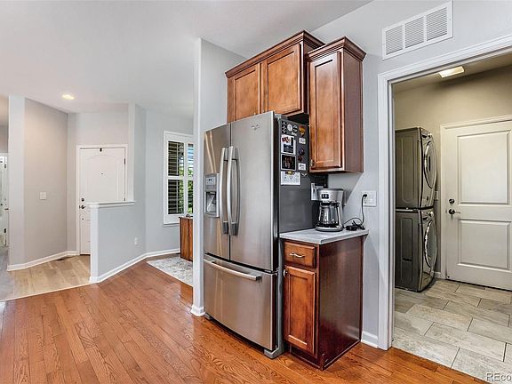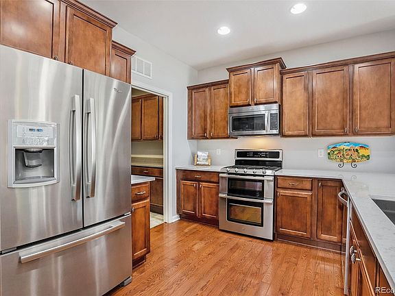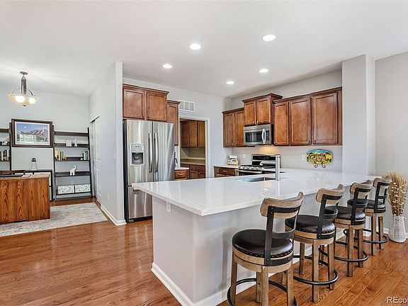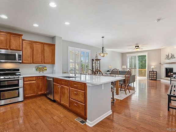 Welcome to one of the most beautifully maintained model quality home in the prestigious Anthem Ranch 55+ active lifestyle community of Broomfield, Colorado. Here you will find a world class resort-like living community with over 49 miles of walking trails with panoramic mountain views around every turn. The community is anchored by a spectacular 32,000 sq.ft. exclusive community center that includes indoor and outdoor pools, full workout center, tennis, pickleball courts, and a plethora of community events and entertainment areas. Your opportunity to join this incredible community awaits with this beautiful ranch style, low maintenance home. Whether you call this home for six months or year round, this home has it all! An open inviting floor plan that is flooded with natural light through the large windows and soaring ceilings. The spacious floor plan features a spacious open kitchen with the finest upgrades and quality finishes including Quartz, stainless steel appliances and upgraded cabinets. The perfectly located dining area is an amazing space for everyday dining or hosting family and friends for special events. The large family room is spectacular. You will love the extended gleaming hardwood floors, elegant shiplap wood faced fireplace, and the over-sized windows that perfectly frame the outdoor living space. The private and relaxful master suite is a must see. This incredible space offers a tray style ceiling and features a luxurious en suite with an extended walk-in shower, huge walk-in closet, and custom barn-style doors. The main floor is complete with a private study / sitting space, 2 additional bedrooms, full bathroom, and a convenient laundry area. The full basement is ready for storage or a blank slate for your specific finishing ideas. The outdoor living area is ready for summer with an over-sized deck and a meticulously maintained yard and common areas. Located on a premiere corner lot with mountain views, and an extended drive with 2 car garage.