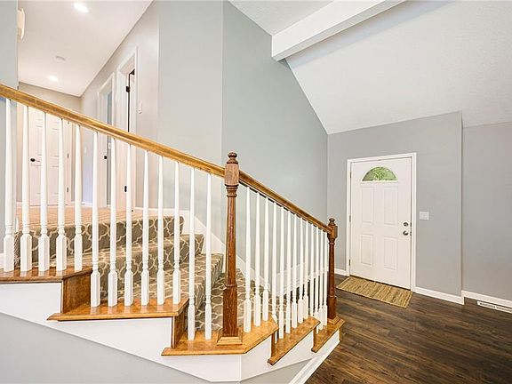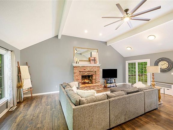 This Olathe home has the space and updates that make the whole place shimmer! Entertain on the multiple levels inside and outside starting with the wide-open great room revealing vaulted ceilings, a brick-framed fireplace and deck access. New kitchen countertops end in a sleek waterfall edge over the peninsula. New flooring and windows with a dedicated bedroom level upstairs. Two is definitely better than one with double closets and double sinks in the primary suite. Work from home secluded in the lower level basement or use as a second living room for movie night with its own half bath. Eat-in kitchen walks out to the patio. With a deck and patio plus a dedicated area for the custom playset, there is still plenty of fenced yard to enjoy. Upkeep is a breeze with sprinkler system. Awesome neighborhood location super close to the elementary school and a 12+ acre park!
