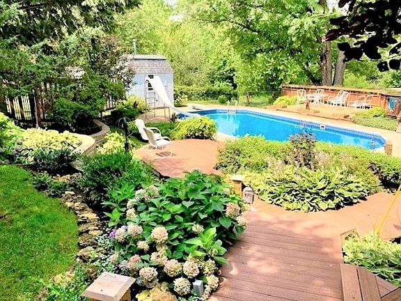 Spacious ranch with open floor concept offers large formal foyer with wood parque flooring. The formal living room has vaulted ceilings, gorgeous window design and woodburning fireplace. Updated kitchen opens to the formal dining and den area with French doors to the deck. Mud room off the garage. Main floor laundry. Master suite has it's own bath. Main bath has jetted tub and separate shower. Finished walk-out lower level features sun room, family room, rec room with a wet bar, 4th bedroom, bath and storage room. Fenced backyard with a 39x16 heated inground pool offering diving board, slide and a deep end. Multiple decks and impeccable landscaping surround the property. New Iron Curtain System (2023), Roof (2020), Steel Soffits. This is a one of a kind home with Lake Access and perfect for Entertaining!