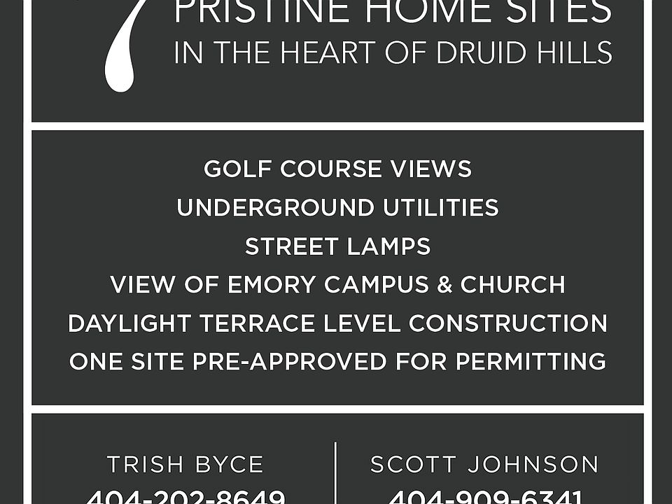 NEW PRICING. BUILD ACCORDING TO YOUR OWN STANDARDS. NOT RESTRAINED BY DEKALB HISTORIC DISTRICT. LOT 2. Lots 1-5 border Druid Hills Golf Course. Lots 6-7 rise above Clifton Road with views of Emory Univ. Minutes to downtown Atlanta attractions. Walk to Emory Univ, Med Ctr, CDC. Adjacent to Burbanck Park. The only home sites in Druid Hills for new construction. Shovel ready, sewer, underground utilities in place. Build your home with 21st century conveniences. Build permits through Dekalb County only.