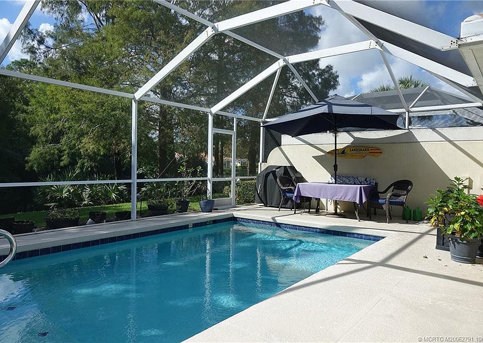 Prime Palm City lаkеѕide villа with а pool offering prіvaсy with water front and preserve views. Brand new barrel tile roof 2025, new AC 2024. Meticulously maintained, light and bright open floor plan 2-bed / 2- full bath, 1,540-sqft DiVosta model. Recent upgrades include luxury vinyl plank flooring throughout, and granite countertops in the kitchen and master bath. The home features two master suites, an air-conditioned glass lanai overlooking the water, an attached 2-car garage and complete accordion hurricane protection. trucks and motorcycles allowed. Two pets any size. Parkside is a happy friendly community. Great quiet location with very quick access to I-95 and the Florida turnpike shopping, dining and boating in desirable Palm City or head over the bridge to historic downtown Stuart. Low HOA fees include cable TV, internet and landscaping. Move-in ready — enjoy peaceful mornings on the patio or take a dip in the pool.