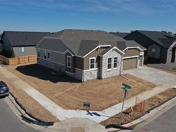 Our most popular plan! This Tenley ranch is situated on a south facing, corner home site. Upgrades include a gourmet kitchen with an expansive Designer island, Quartz countertops, upgraded sink, stainless appliances (including double ovens) and linen colored cabinets. Extensive wide plank laminate flooring adds to the flow of this open plan. Generous study with French doors, upgraded fireplace with media wall and tile surround, 5 piece master bath, mud room cubbies and convenient home center add beauty and livability to this home. Upgraded tile, paint, faucets and railing. Master privately situated away from other bedrooms. Fencing already in place at rear and one side of yard. Quiet golf course community with easy access to I-76, E470 and DIA. Pictures of similar model. Price shown reflects lender incentive. Buyer must use builder's preferred lender to receive this incentive/price.