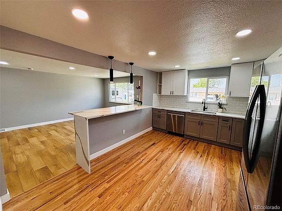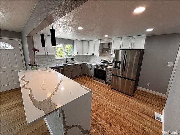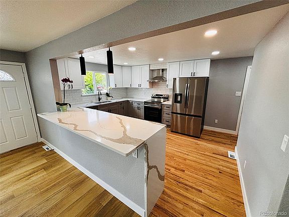 WELCOME HOME TO THIS STUNNING SOUTH GOLDEN RANCH INSIDE AND OUT*REMODELED KITCHEN WITH SHAKER CABINETS & QUARTZ C-TOPS w/NEW APPLIANCES*REMODELED BATHS w/SHAKER CABINETS & QUARTZ COUNTER TOPS*NEW LVT FLOORING FROM THE ENTRY INTO SPARE BEDROOMS*HARDWOODS IN THE KITCHEN AND PRIMARY* NEW LIGHTING FIXTURES THROUGHOUT*TANKLESS HOT WATER HEATER*1 CAR GARAGE w/DRYWALL INTERIOR*NEW INTERIOR AND EXTERIOR PAINT*NEW 2 CAR DRIVEWAY AND BONUS OFF STREET GRAVEL PARKING SPACE*VYNYL WINDOWS*WASHER/DRYER INCLUDED*LARGE WATER FEATURE IN THE BACKYARD* UPPER BACKYARD GARDEN AREA w/FRONTRANGE MOUNATIN VIEWS ALONG WITH SOME MOUNTAIN VIEWS FROM FRONT FAMILY ROOM WINDOW AND FRONTYARD* IN ADDITION, THE BACKYARD HAS A METAL CUT OUT SPANNING THE RETAING WALL AS AN EXTENSIVE YARD ART PIECE REPRESENTING THE FRONT RANGE MOUNTAINS*HEATED SHED* TURN KEY*LOW MAINTENANCE AND READY FOR YOU!