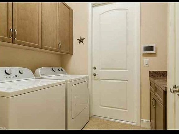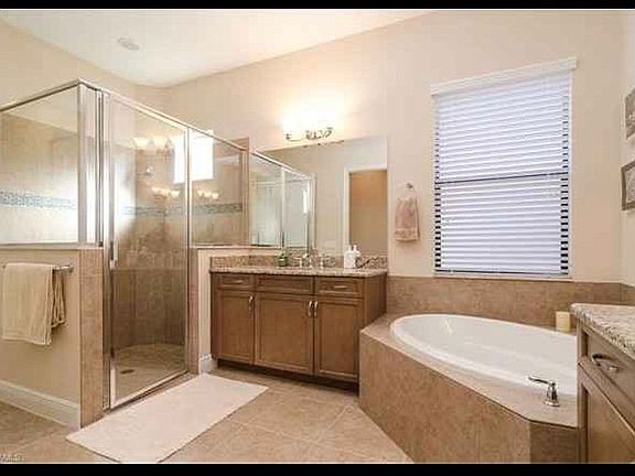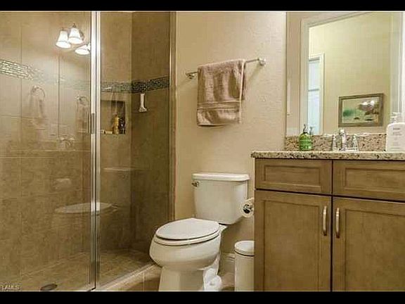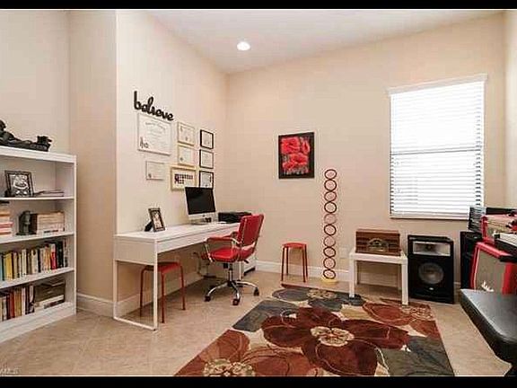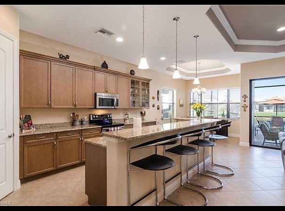 Gorgeous one-story home with over 2,000 square feet of well-planned living area. This move-in ready home offers 3 bedrooms, 3 full bathrooms, including a guest bedroom with private ensuite, a den that could transition into a 4th bedroom, and a two-car garage. You'll have all the bells and whistles in a kitchen that features stainless steel appliance package with fridge and dishwasher 6 months old and microwave 1 year old, walk-in pantry, 42" cabinets with soft close drawers, and granite counters. Tray ceilings and archways add interest throughout the home. Tile laid on the diagonal in the living areas and den and wood laminate flooring in the bedrooms. Extended screen lanai with paver deck and pet run, and room to add a pool. Security system, a gated community, and low association fees that include landscape maintenance and CenturyLink 100 Mbps HSI (high speed internet) over fiber. For entertainment there is a community fitness center, basketball court, children's play area, pool and spa. Highly desired schools and excellent location with easy access to the beach, downtown Naples, and I-75. Fast closing possible!