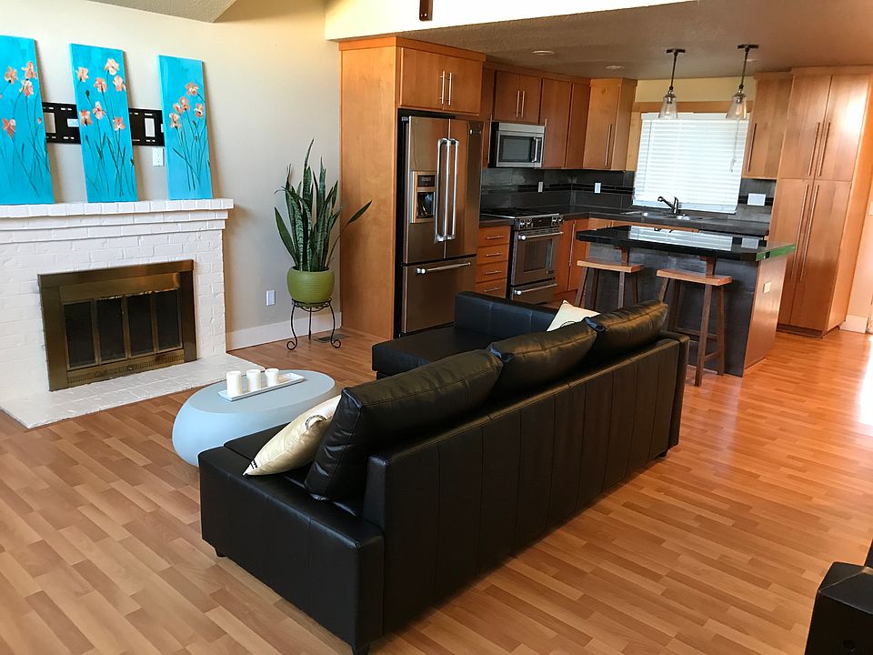 Light & bright open floor plan w/soaring vaulted ceiling in the living room. Updated kitchen features granite countertops, SS appliances & large island. Two spacious bedrooms on the main level w/an updated full bath. Expansive master suite w/ large walk-in closet, master bath features double sinks & tile shower w/dual shower heads. Good sized fenced yard w/covered deck. 2 car garage & central A/C. Minutes to schools, dining & shopping!