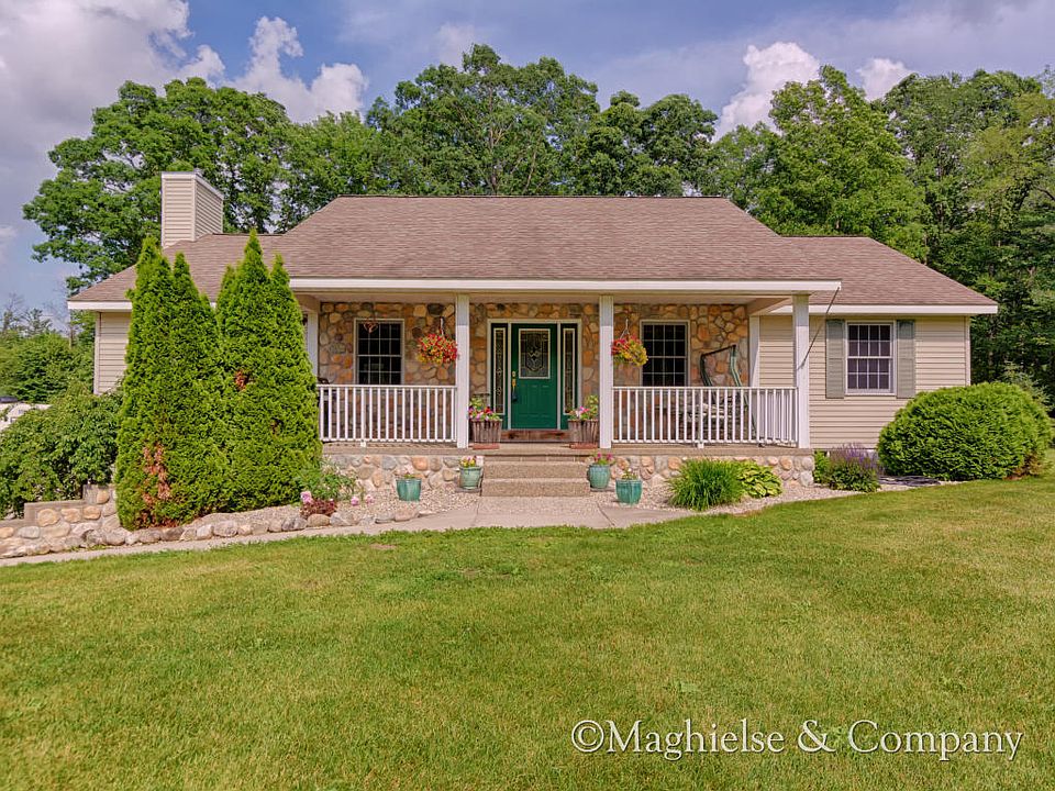 Buy this Home & We'll Buy Yours!! (Conditions apply). Call The Maghielse Team 616-977-0900. Enjoy country living in this sprawling 4 BR, 3 full BA ranch on 2.82 acres offering 3,200+ sq ft of comfortable living space! You'll love the open concept floor plan. The kitchen boasts a center island w/snack bar & dining area offers French door access to deck & pool. You'll love the living room, w/vaulted ceilings & gorgeous floor-to-ceiling fireplace flanked on each side by impressive arched windows. The main floor also offers a private MBR suite w/luxurious Jacuzzi tub, BR #2, a 2nd full bath & a laundry room. The lower level offers a great family room w/wet bar & cozy woodstove, 2 BR & a 3rd full bath w/walk-in shower. There is much to delight you outside too! A 24' above ground pool w/decking to make the summers more enjoyable, a covered front porch for relaxing, gorgeous landscaping everywhere you look, including a small pond. And a 32 x 64 ft, 3 stall pole barn w/man cave w/half bath.