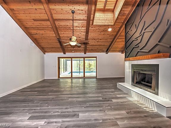 Welcome to Hertitage Farms,the most desired and established neighborhood in Fort Myers. This 3 bedroom/2 bathroom home has a pavered circle driveway that sits on almost 1 acre of land. As you enter the home you are greeted with a fabulous wood burning fireplace with awesome wood detail bringing a mid-modern style to a very contemporary home. Luxury Vinyl flooring throughout, granite kitchen with custom stainless steel sink, dual fuel range with gas stove & electric oven. Living room overlooks the spacious pool & spa area with panoramic view screen cage & plenty of room to entertain. Pebble Tec concrete pool, gorgeous travertine pool deck, exterior paint 2023, brand new electrical panel, all new PEX plumbing, Metal roof, brand new pool pump & electrical wiring, new hot water heater & more! AC 2019, but new capacitors 2023. There are many features of this house that you do not want to miss. Nothing was spared with this home! Privacy is unreal as you will never have a house behind you! Close to beaches & centrally located in South Fort Myers in the heritage farms community. Schedule your showing today to see this beauty!