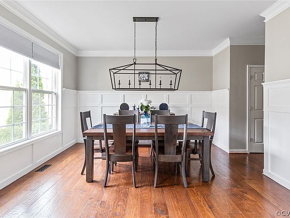 Entertain in style within the formal dining room, modern chandelier, upscale trim package, & the same engineered wood flooring that elevates the entire home’s aesthetic. The large living room is bathed in natural light, thanks to the triple windows overlooking the rear & additional windows flanking the gas fireplace, creating an ambiance of openness and warmth. This space effortlessly opens up to the kitchen, featuring resurfaced cabinets, granite countertops, recessed lighting, & updated appliances including a newer dishwasher, stove, & microwave.