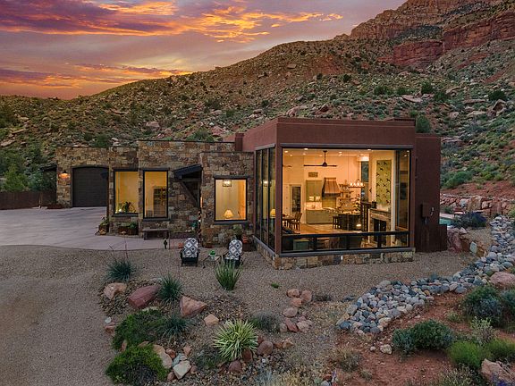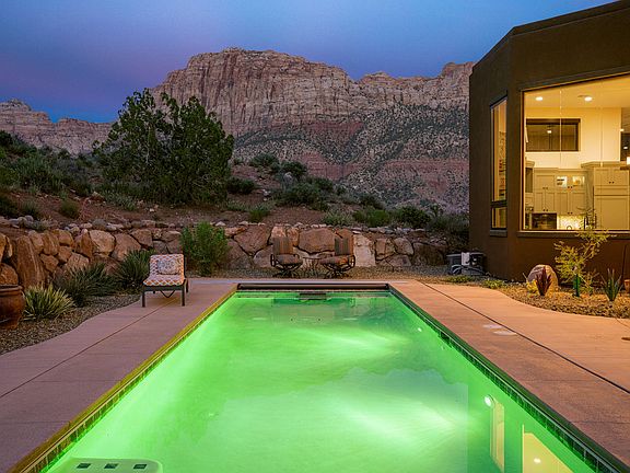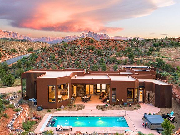 This magnificent custom home built by Mark Fahrenkamp, boasts unparalleled privacy, craftsmanship and breathtaking views of Zion National Park. With its unique, artistic flair and attention to detail, this home offers the perfect blend of luxury and comfort. The exquisite upgrades and features are listed in our photos section, please note the fastidious care that's been taken at every opportunity to afford not only an incredible living space now, but an opportunity to grow as needs change with pre-planning during construction. Outdoors, you'll find a natural, inviting yard and extra large covered patio area and outdoor kitchen and heater. The gorgeous pool has a fast-lane swim current machine and the bullfrog hot tub make a great combination for exercising and relaxing. This oasis is perfect for hosting outdoor gatherings or enjoying the peaceful scenery and the occasional wildlife visitors who stop by. The Claret Cup subdivision consists of almost 22 acres with only 6 home pads. The balance of the acreage is in a conservation easement to protect the natural landscape. Each location was precisely planned to capture one-of-a-kind views of Zion National Park which bounds the entire tract of land on two sides. This perpetual easement means that nothing will be built between your home and your view....ever! From the moment you step inside this masterpiece, you will be swept away by its grandeur and sophistication. The expansive ceilings, and beautiful views of Zion are just a few of the many features that distinguish this home from the rest. The living areas are spacious and inviting, perfect for entertaining guests or relaxing with family. The gourmet kitchen is a chef's dream come true, featuring hand picked top-of-the-line appliances, a large center island, and plenty of counter space for meal prep. One of the standout features of this home is its rare RV garage, which is perfect for storing your recreational vehicles or boat. The garage is equipped with all the necessary mechanical details to make it functional and secure. See our inclusions lists for all the impressive details. The bedrooms are spacious and offer plenty of natural light and stunning views of the surrounding landscape. The bathrooms are equally impressive with luxurious finishes and fixtures. In summary, this custom home is a masterpiece of design and engineering, offering the perfect combination of luxury, comfort, and functionality. Its artistic flair and mechanical details are sure to impress even the most discerning buyer. The listing broker's offer compensation is required only to participants of the Washington County MLS but will be extended to anyone with an active Utah Real Estate License by written agreement of said compensation.