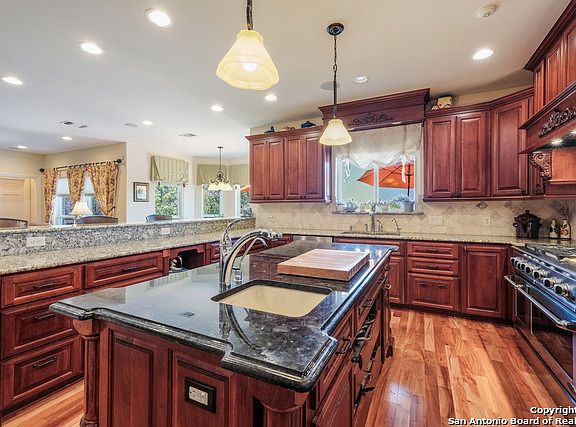 VIEWS, VIEWS, VIEWS Exceptionally hard to find FULLY FURNISHED privately gated estate on 5.1 acres overlooking Government Canyon Park with PANORAMIC views thanks to wrap around patio AND balcony brings the ultimate in tranquility! Sparkling Keith Zars pool! Epicurean island kitchen w/ prep sink features custom Michael Edwards cabinetry, six burner plus grill gas range w/ double ovens, climate controlled wine storage, HUGE walk-in pantry, granite counters...truly a kitchen to live around! Spacious family room w/ dramatic rock fireplace & wet bar! Full guest suite down w/ walk-in shower! Simply STUNNING master retreat with sitting room features the most amazing views from a private wrap around balcony! Master bath boasts whirlpool garden tub for soaking the day away, walk-in shower, his & her vanities & his & her walk-in closets! TWO utility rooms (one up and one down)! Private study w/ built-ins! Large secondary bedrooms with quaint window seats share a Jack and Jill bath! Elegant formal living w/ architectural ceilings! Dining features built-in China cabinet and outdoor access for entertaining! Country living with city convenience! Solar panels for energy savings! Truly a MUST SEE!