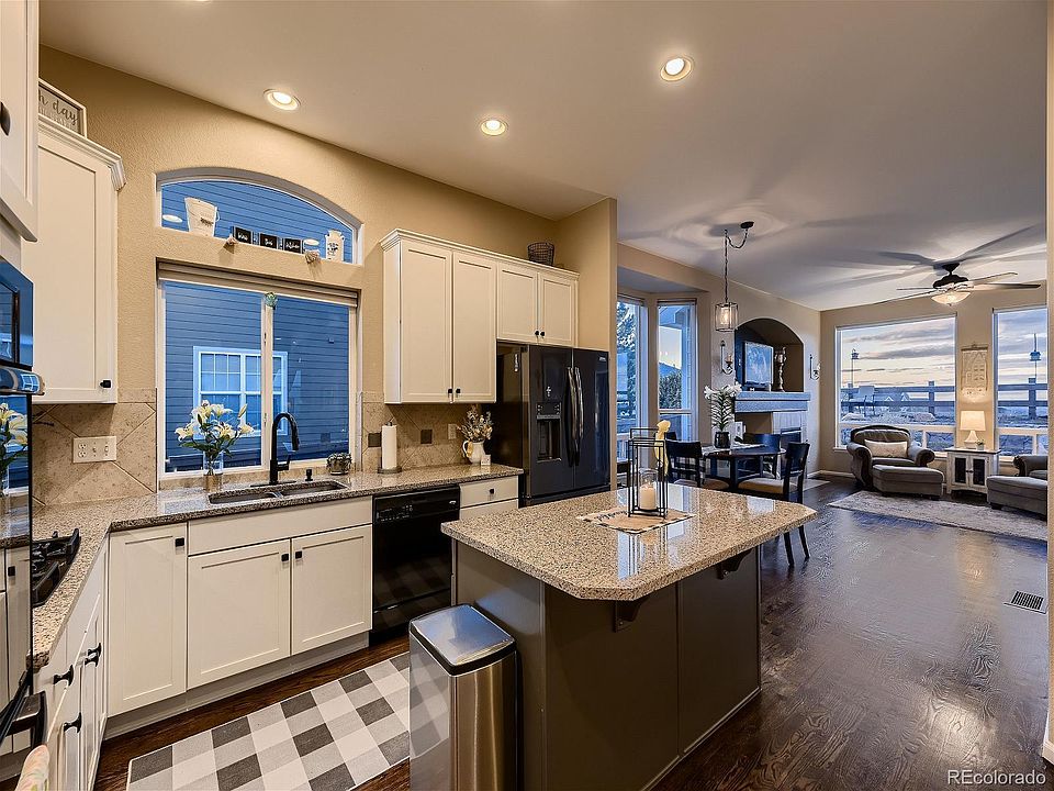 You are invited to discover the meticulously cared for ranch-style home, upgrades galore w/ 10' main floor ceilings. The heart of this “entertainers dream” is an open floorplan with kitchen, hearth room, dining room, living room and outdoor Colorado room designed for friends and family gatherings. Large windows frame professionally landscaped backyard allowing sunlight to flood the space, enhancing the overall welcoming ambiance. Updated Farm-style kitchen w/ new Frigidaire refrigerator, granite counters, double ovens, gas cooktop, + island with seating. Beautiful oak hard-wood floors throughout the main living area. The spacious primary suite boasts a 5 piece updated bathroom with large soaking tub and ample closet space. Main floor laundry, fully updated bathroom. 2 additional bedrooms provide comfort and privacy for everyone. As you venture downstairs, an expansive professionally finished basement awaits w/ two additional bedrooms, modern bathroom and multiple entertainment areas that cater to various leisure activities. Whether you're in the mood for a cozy movie night, music, a game of billiards or a workout session. This basement has it all, including large storage room w/ wine rack, wine cooler and fridge. Outdoor space is equally inviting, sheltered Colorado Room, 2-tier rhyolite rock terrace, garden boxes, privacy fence, dog run, mature trees all backing to quiet open space, yet very low maintenance. Enjoy bird watching, your favorite music, gardening and peaceful evenings. New Class 4 roof in 2023! Three car finished garage with new insulated garage doors, epoxy floor, fridge, wall shelving and garden tool organizers. You'll enjoy the tranquility of suburban living while being in close proximity to the best of Parker; easy access to miles of trails, minutes from Rueter-Hess Reservoir and Challenge Incline. Centrally located:10 minutes from 1-25, 5 minutes from Hwy 83. This beautiful home seamlessly combines style, comfort, entertainment, and convenience.