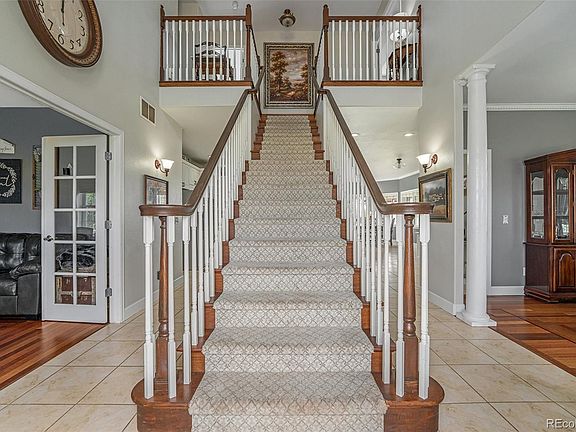 Sitting on a sprawling 38-acre lot, this magnificent custom home with fully finished walk-out basement exudes timeless beauty and impeccable craftsmanship. Step inside to discover a gourmet kitchen adorned with exquisite granite countertops and pristine white cabinets. Adjacent to the kitchen, a spacious breakfast nook provides the perfect spot for casual meals, while a separate formal dining room offers an enchanting setting for hosting memorable gatherings. Brazilian Cherry hardwood floors catch your eye, bestowing a sense of grandeur throughout the home. The expansive family room beckons with its warm ambiance, complete with a cozy fireplace, creating an inviting space to relax and unwind. A convenient main floor office awaits, providing a tranquil sanctuary for work or study. Crown molding adorns the ceilings, gracefully enhancing the overall aesthetic appeal. The master retreat is a true oasis, providing a haven of tranquility with its generous proportions and luxurious finishes. Additionally, a secondary retreat offers an additional private space for relaxation or indulgence. Quartzite countertops in master bath. No detail has been overlooked in this home's design, as each of the five bedrooms boasts expansive closets to accommodate all your storage needs. Descend to the finished walk-out basement and be captivated by the custom knotty alder doors and cabinets, imparting a rustic but modern charm. Here, you'll find a wet bar with quartzite counters, a second office space, and a spacious bedroom with a breathtaking en-suite bathroom, ensuring comfort and convenience for all. Basement is a walk-out allowing for possibility of a income producing rental space. Stepping outside, a sense of serenity envelops you as you encounter the expansive covered patio, framed by majestic mature trees and meticulous landscaping. For those with equestrian or recreational interests, fenced corrals and a large 60x40 barn/outbuilding await, providing endless possibilities.
