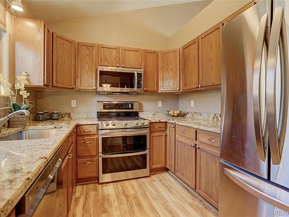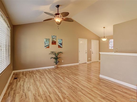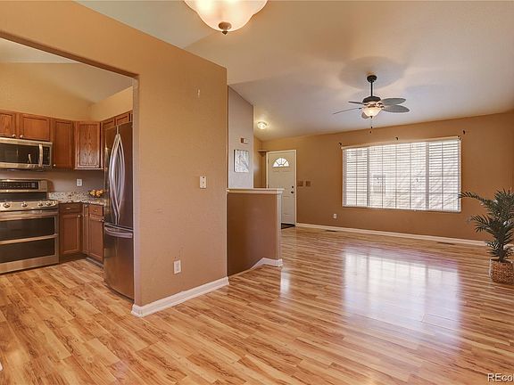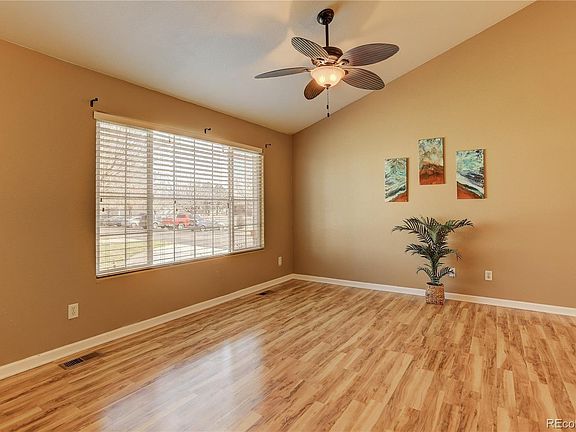 Welcome to main floor living and low maintenance in this ranch style town home! Spacious living room with vaulted ceilings open to dining area. Kitchen boasts granite counters, newer LG SS appliances and plenty of cabinets for your storage needs. Concrete patio off of dining area great for BBQ's and relaxing in the afternoon sun. Grassy area in back yard great for pets or yard games. Large master bedroom with vaulted ceiling and attached master bath. Two remaining bedrooms have generous sized closets. Easy care wood look laminate flooring through out. Full basement contains laundry area complete with washer and dryer. Almost 1,000 square feet in basement with 2 egress windows, ready for you to finish as you like. New furnace to be installed in property. Over sized 1 car attached garage is fully dry walled and 20 feet deep. Close to shopping, I-70, Hwy 225 and Airport/Pena Blvd - less than 30 minute commute to Denver International Airport. This is a great home that won't last long!