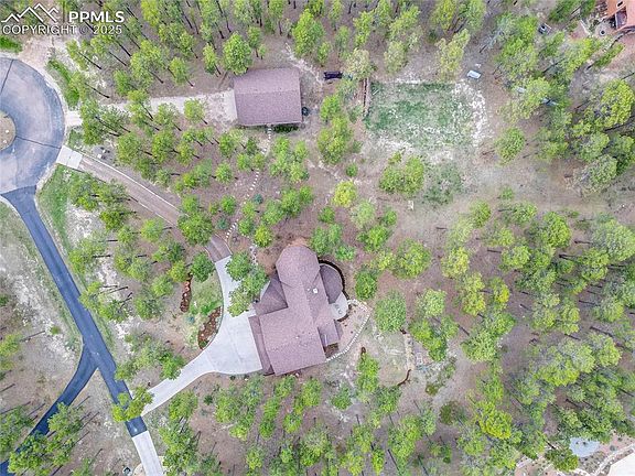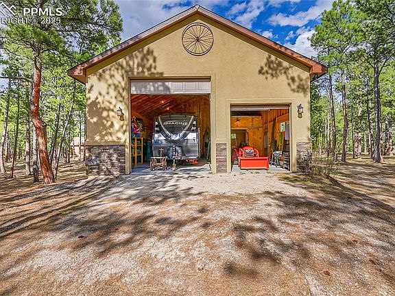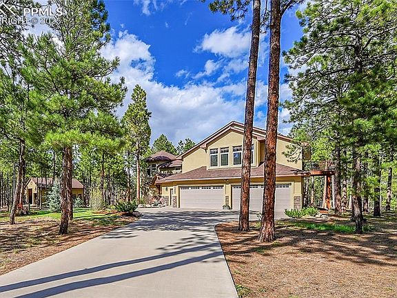 Welcome to the distinguished Black Forest Reserve, an exclusive gated community offering effortless access to Colorado Springs & Denver. Privately positioned at the end of a cul-de-sac on over two acres of mature pines, this newly stuccoed estate offers over 4,400 sf of luxurious above-grade living. Designed for main-level living with ADA-compliant features with Elevator. Inside, discover 4 bedrooms, 4 bathrooms, 3 fireplaces, a Chefs kitchen with stainless steel appliances, 6 burner gas stove, and walk-in pantry. The main-level primary retreat offers its own backyard access, a large walk-in closet with washer & dryer hookups, 5 pc bath w/heated flooring, soaking tub, seamless entry steam shower w/dual shower heads. Main-level amenities also include living room w/gas fireplace, well appointment laundry room, mudroom w/built-ins, bathroom, second bedroom, knotty alder pine wood doors/trim/and wonderful hydronic heated floors throughout. The grounds are impeccably maintained, finished oversized 4-car garage, a 32x42 detached RV/workshop garage with one 12’x14’ and two 9’x10’ overhead doors, insulated shop, heavy-duty overhead storage and both 30A and 50A outlets — ideal for RVs and hobbyists. The upper level showcases 2 bedrooms,2 bathrooms, a dramatic great room w/soaring ceilings and a wood-burning stove, a flexible space with Murphy bed, abundant storage, outdoor deck overlooking the towering pines, built-in bookcases, a second living area with fun wet bar w/partial hydronic heated floors. Pride of ownership shines in custom touches like hand-blown glass light fixtures, thermostat zone, and beautiful wood detail. Outdoor living is elevated with a covered back porch featuring a wood burning fireplace, exterior TV mount, hot tub hookups, fenced garden and a tranquil water feature. New roof, has A/C, and beautiful wood detail. HOA is quarterly. Move in ready! Close to Falcon restaurants & shopping. A rare opportunity to experience Colorado living at its finest.