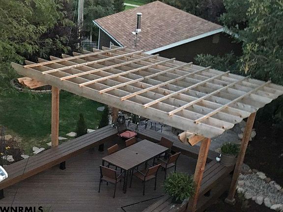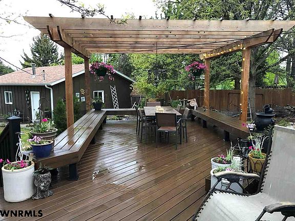 Absolutely beautiful home in the Gering Northfield area. Overlooking Northfield Park. you can enjoy all seasons in the back yard on the professionally designed and constructed deck featuring a pergola and built in stone firepit. Backyard features a second 2 stall heated garage, xeroscaping, a dry river bed for drainage, 2 seating areas on the deck. Updates throughout this home to include granite kitchen island, new hardwood flooring in living room and entry way. The main floor features large kitchen with built in desk, a formal living room, formal dining, primary suite with new bathroom, 2 additional bedrooms, updated hall bathroom, informal living room with wood burning fireplace and doors that lead to deck. Main floor laundry for added convenience. 2 stall attached garage. Updated basement features a third living room with woodburning stove insert, large gaming/rec space, large 4th bedroom, 3/4 bath, and a huge storage room.